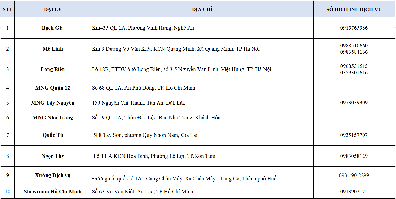 - Mạng lưới xưởng dịch vụ phân bố trên toàn quốc, đáp ứng nhanh chóng, tận tâm.