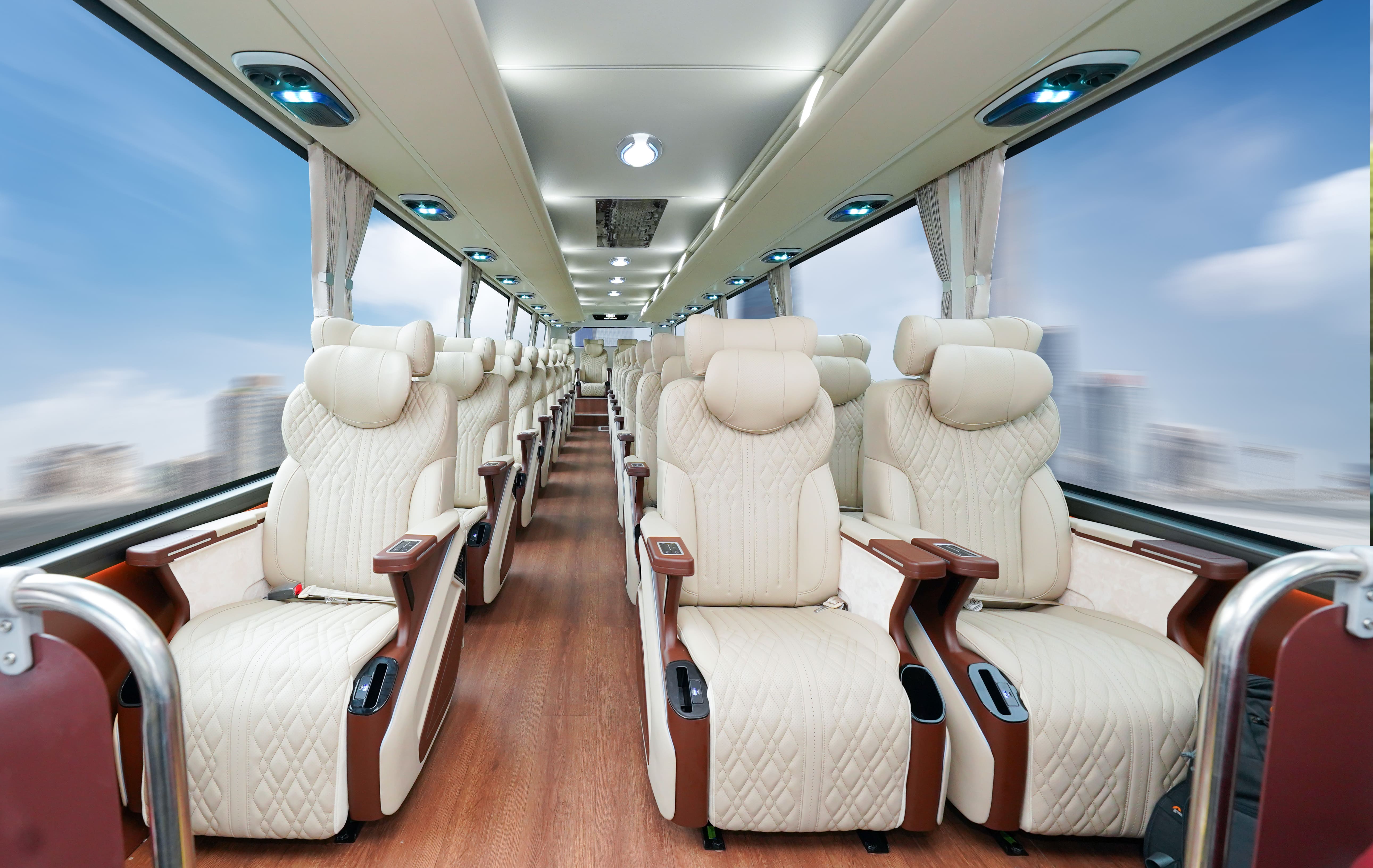 KIMLONG 99–N29 là dòng xe bus ghế ngồi phiên bản cao cấp, tạo ấn tượng với thiết kế sang trọng và khoang hành khách rộng rãi, thoải mái. Toàn bộ ghế được nhập khẩu và bọc da cao cấp, mang lại cảm giác tinh tế và sang trọng. Mỗi ghế được trang bị cổng sạc USB/Type C, bàn ăn gấp gọn vừa tiết kiệm không gian nhưng không kém phần tiện lợi.